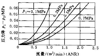 像过滤器、油雾器之类的气动元件,空气在它们内部的流动基本上都处于不可压缩流动的范围。利用定常法测试原理,测定的流量-压力降特性曲线如图所示。从图中便可差的元件在一定进口压力P1和通过流量下的压力降P1-P2。